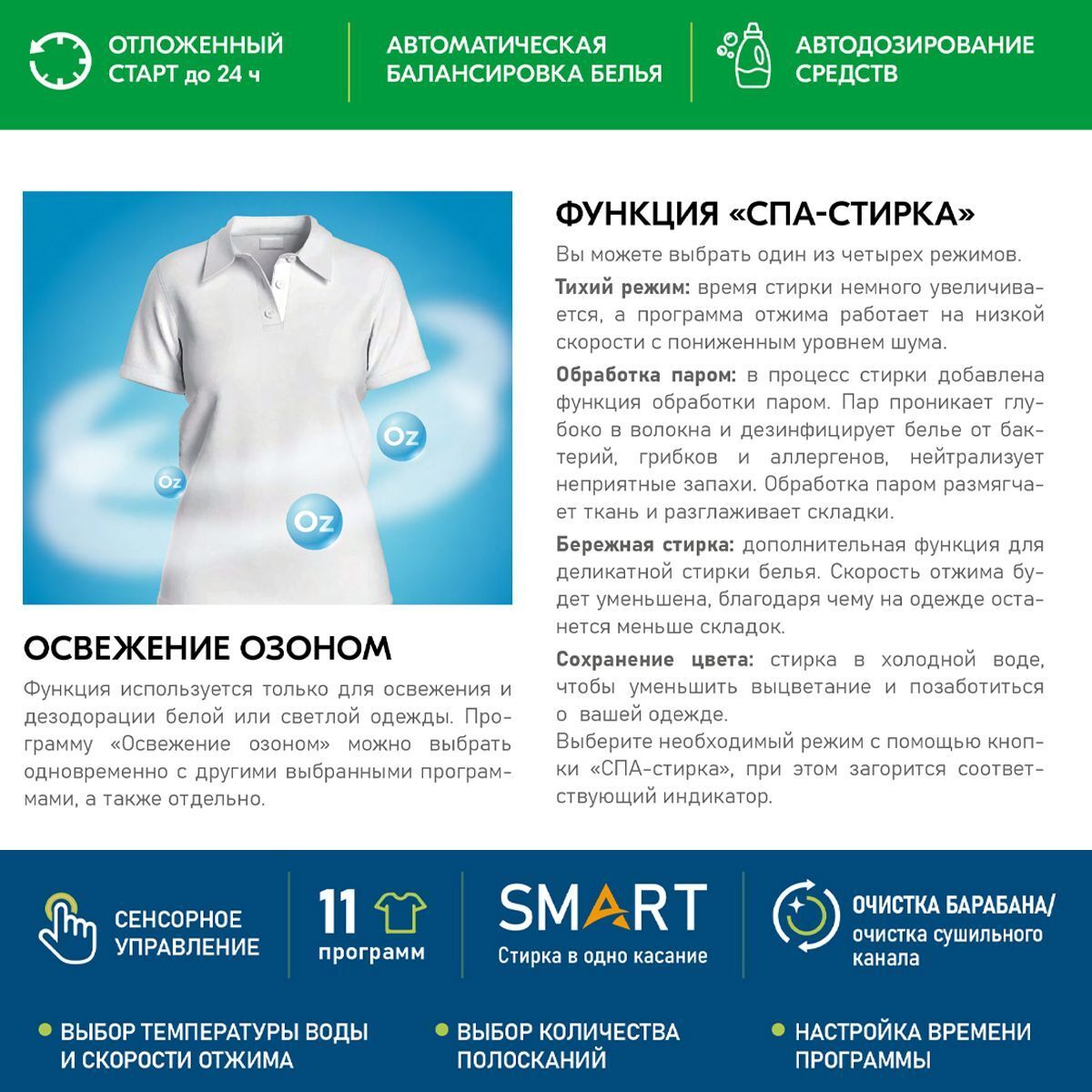 Smart; Автоматическая балансировка белья; Автодозирование средств; функция сушка; обработка озоном; Догрузка белья; Мое время; Отсрочка старта; Очистка барабана; Инверторная система; Увеличенный объем камеры; Электронный регулятор устойчивости
